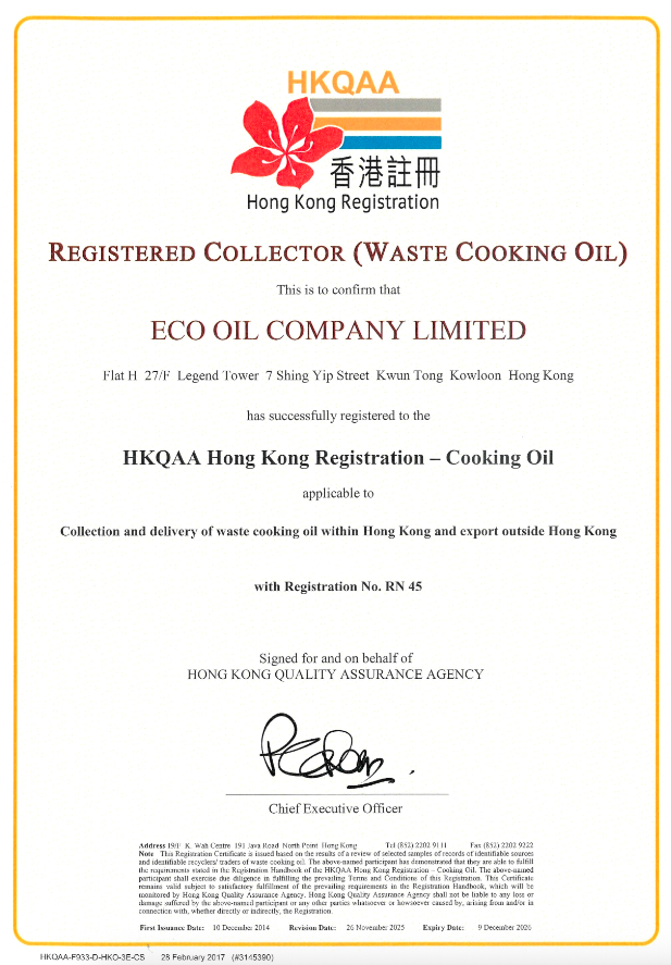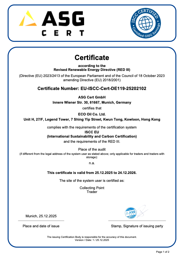 ISCC EU 自我聲明 UCO (版本 2.3,更新至 2025 年 9 月 30 日) 英文版 The self-declarations for deliveries of used cooking oil on this page are a valid part of the contract between Eco Oil Co. Ltd. and its customers. The self-declaration will be presented to the customer either within the contract or within the terms and conditions. If the self-declaration is part of the written contract, it shall be considered to be accepted from the effective date of the contract. If the self-declaration is included in the terms and conditions, then it shall be considered to be accepted if the customer does not submit an objection to Eco Oil Co. Ltd. within 14 days after the terms and conditions have been presented to them. If the customer does not object, this will be considered as an agreement to the terms and conditions. The self-declarations will be considered to be accepted after the 14 days have passed.